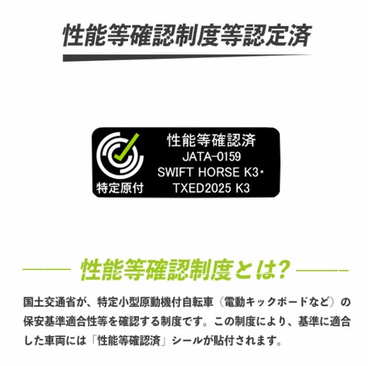 特定小型原付として必要な性能試験に合格済み。