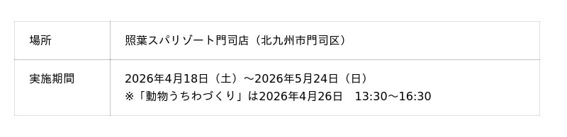 株式会社ナカシロが運営する北九州市門司区の温浴複合施設「照葉スパリゾート門司店」は、地北九州市の動物園「到津の森公園」とコラボレーションし、動物たちの魅力を身近に感じられる特別企画を2026年4月18日(土)から5月24日(日)まで開催いたします。