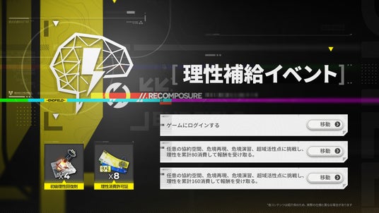 「育成強化応援」初心者イベントが常設開催され、オペレーターのレベルやスキル、素質、武器強化時に、一定の段階に到達すると対応する育成素材が大量に返還されます。該当目標を達成している場合、バージョンアップ後にイベント画面から素材を直接受け取ることができます。