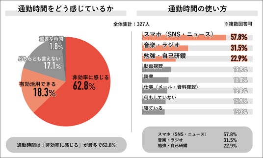 回答者全体の327人に、通勤時間をどう感じているかを聞くと、「非効率に感じる」が62.8%で最多となり、「有効活用できる」が18.3%、「どちらとも言えない」が17.1%となりました。また、通勤時間の使い方を聞くと、「スマホ(SNS・ニュース)」が57.8%で最多となり、次いで「音楽・ラジオ」が31.5%、「勉強・自己研鑽」が22.9%となりました。