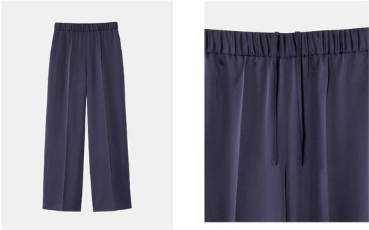 なめらかな落ち感と微光沢なサテン生地が上品なイージーパンツ。ウエスト位置から裾まで入るセンタープレスが脚のラインをまっすぐ見せます。肌触りが良い素材と、総ゴム仕様のウエストにより、リラックス感のあるはき心地を叶えました。内側の紐で調整も簡単で、吸汗速乾機能付きのため、汗が気になる季節でも快適に着られます。