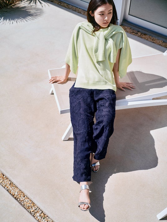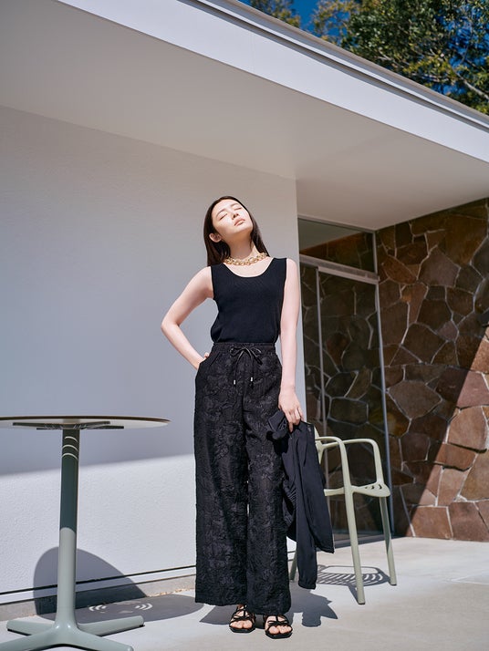 ◯高級感のあるデザインと、ほどよく上品に透ける「シアージャカードイージーパンツ」