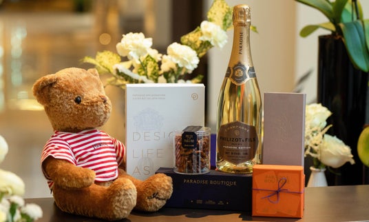 ルームスプレー、ヒノキシャワーセット、パヴェショコラ(4個)、シグネチャーティー(紅茶&緑茶)、クッキー(1種)、Paradise Boutiqueオリジナルクリアバッグ