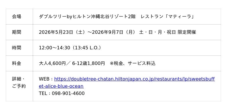 【2026年4月13日】ダブルツリーbyヒルトン沖縄北谷リゾート(北谷町(ちゃたんちょう)美浜(みはま) 統括総支配人 宍倉裕(ししくらゆたか))は、2026年5月23日(土)から2026年9月7日(月)までの土・日・月・祝日限定で、2階レストラン「マティーラ」にて、ランチ&スイーツビュッフェ『アリスと不思議なブルーオーシャン~海底時計が刻むもうひとつの物語~』を開催いたします。