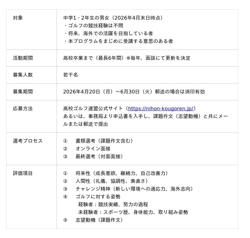 本プロジェクトは、2026年4月末日時点で中学1年生~中学2年生を対象とし、高校卒業までの最長6年間、継続的な育成支援を行います。ゴルフ経験の有無は問わず、将来性や海外での活躍を目指す強い意欲を持つ男女を募集します。