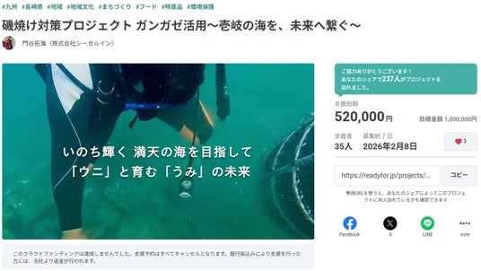 株式会社シーガルイン(代表:門谷隆廣)は、2025年12月28日から2026年2月8日にかけて、厄介者とされるウニ「ガンガゼ」を100%活用し、海の砂漠化問題の解決と持続可能な地域経済の創出を目指す「磯焼け対策プロジェクト」へのご支援を募るクラウドファンディングをREADYFORにて実施いたしました。