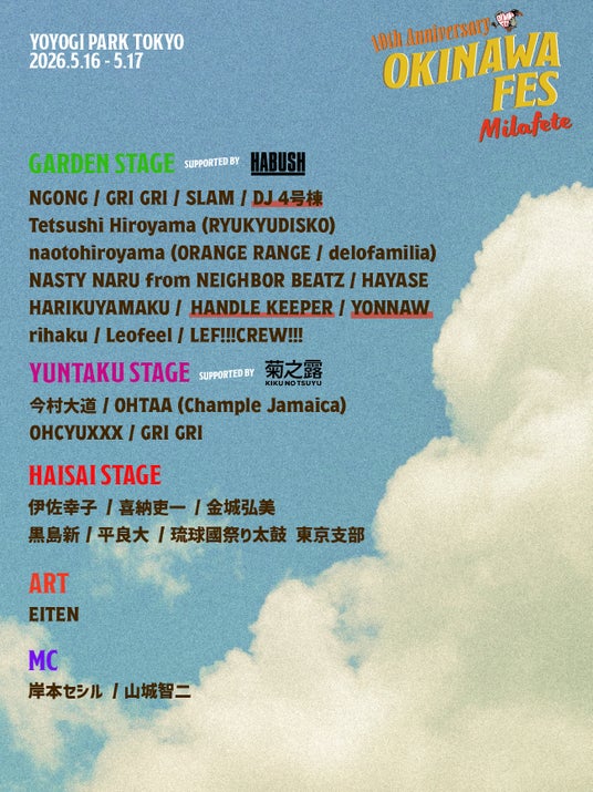 ミラフェート株式会社(所在地:沖縄県那覇市、代表取締役:笠井誉文)は、通算11回目、10周年を迎える「OKINAWA FES Milafete(オキナワフェス ミラフェート)」において、2026年5月16日(土)・17日(日)の2日間、東京都・代々木公園イベント広場にて開催される本イベントの全出演アーティストの発表を行ったことをお知らせいたします。