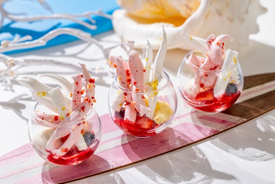 ビーチハウスで味わうカクテルをイメージしたグラススイーツも各種登場します。シーソルトをきかせたスイカゼリーとキウイゼリー、さらに杏仁豆腐をレイヤーにし、まるでスイカのような色合いの「ウォーターメロンブリーズ」、幻想的なブルーのバタフライピーゼリーに瑞々しいマスカットゼリーを重ね、フレッシュマスカットをトッピングした「ブルー・マスカット」、マンゴームース、バニラパンナコッタにジューシーなマンゴーコンポートが南国気分を誘う「マンゴーサンセット」など、涼し気なグラススイーツを片手にカクテル気分もお楽しみいただけます。
