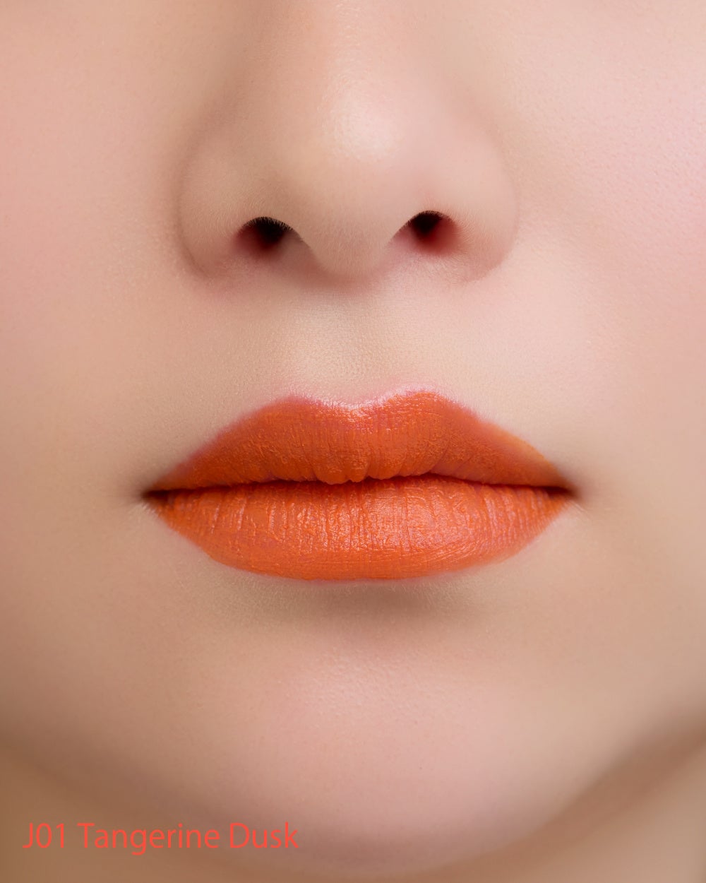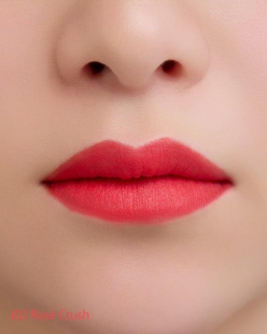 2種のパウダーを絶妙なバランスで配合することで、ベルベットのようにやわらかく、軽やかなマット質感を実現。シルキーな伸び広がり、さらりとしたパウダリーな仕上がりを両立しながらも、粉っぽさを感じさせず、唇に溶け込むように密着します。
