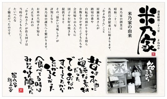 米乃家の創業は昭和23年、名鉄岩倉駅東口に始まります。“およねさん”こと村瀬お米が踏切の番や自転車の預かりをする傍ら、お腹を空かせた子供たちや会社帰りの人たちに団子やお好み焼きを提供すると、その“温かい美味しさ”が評判となり米乃家の誕生へとつながりました。