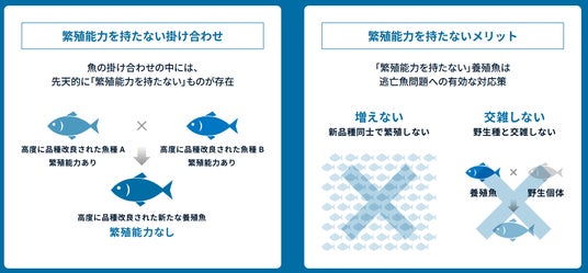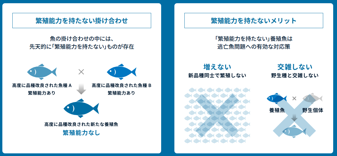 「夢あじ」は、先天的に繁殖能力を持たない「一代限りの養殖魚」となります。そのため、万が一自然災害などで魚が生け簀から逃亡した際にも、夢あじが自然界で増えることはありません。また、野生のカイワリやマアジとの交配が発生することもなく、生態系への悪影響を防ぐことができます。夢あじは、‟品種改良された美味しい魚の養殖”と‟生態系のサステナビリティ”の両立を実現する新たな養殖魚として業界からの期待を集めています。