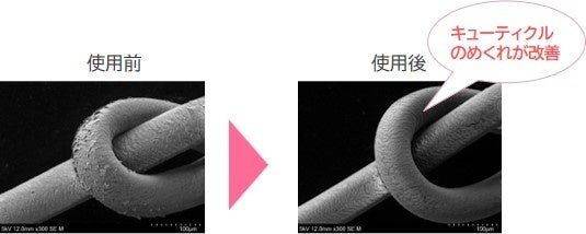 ダメージ毛はキューティクルのめくれが観察されていたが、「ママ&キッズ スムースヘアミルク」を塗布した毛ではそれがきれいに接着されていることが確認できました。