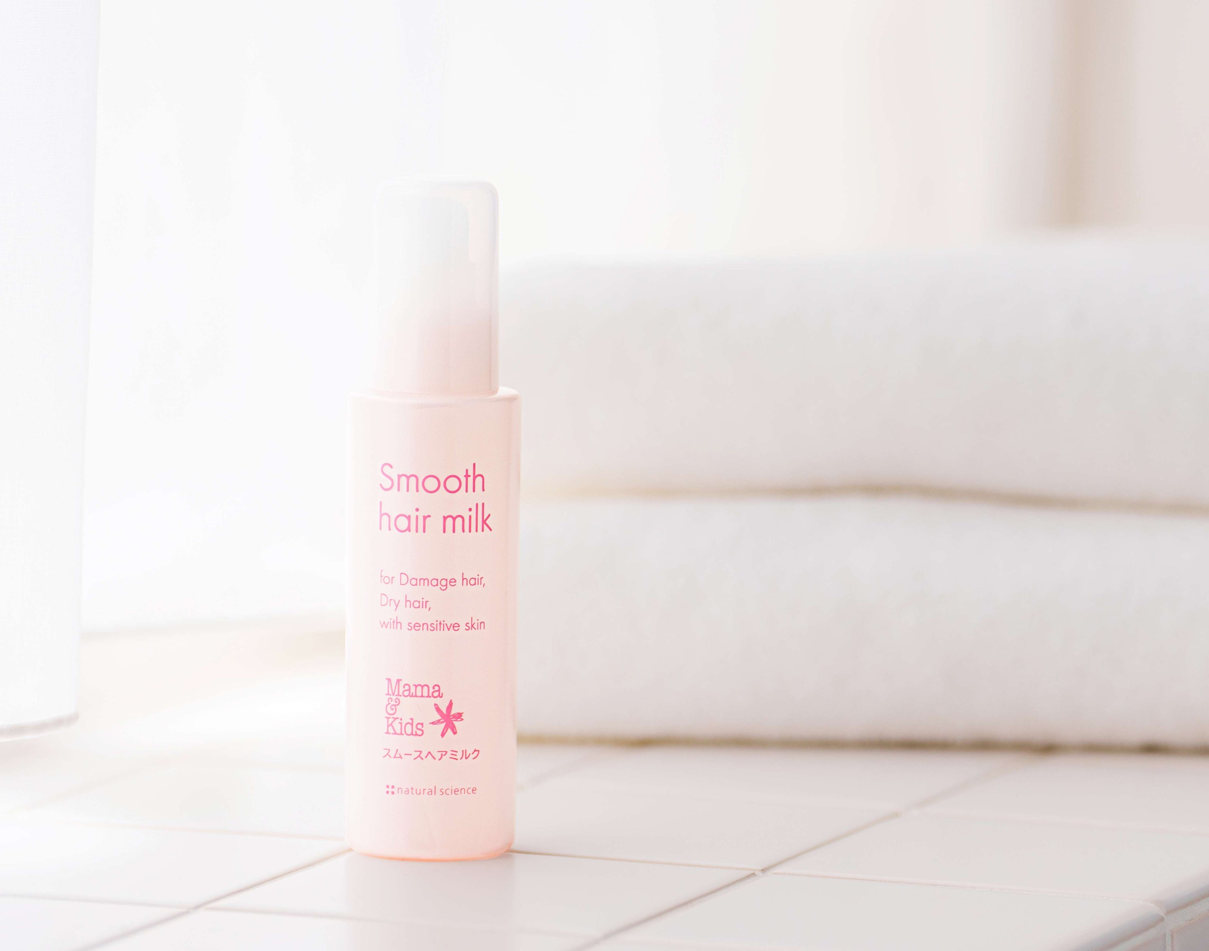 「ママ&キッズ スムースヘアミルク」は、するんとなめらかでツヤのある髪に整える低刺激ヘアミルクです。