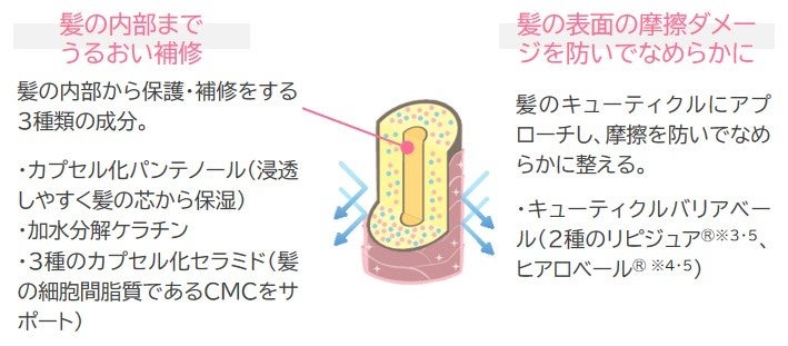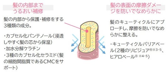 髪の内部から補修をする独自成分カプセル化パンテノールや、髪の表面の摩擦を防いでなめらかに整えるキューティクルバリアベールを配合。さらに速乾&ヒートリペア処方でドライヤーの時間を減らしながら、ドライヤーの熱を利用して髪の芯まで集中補修。