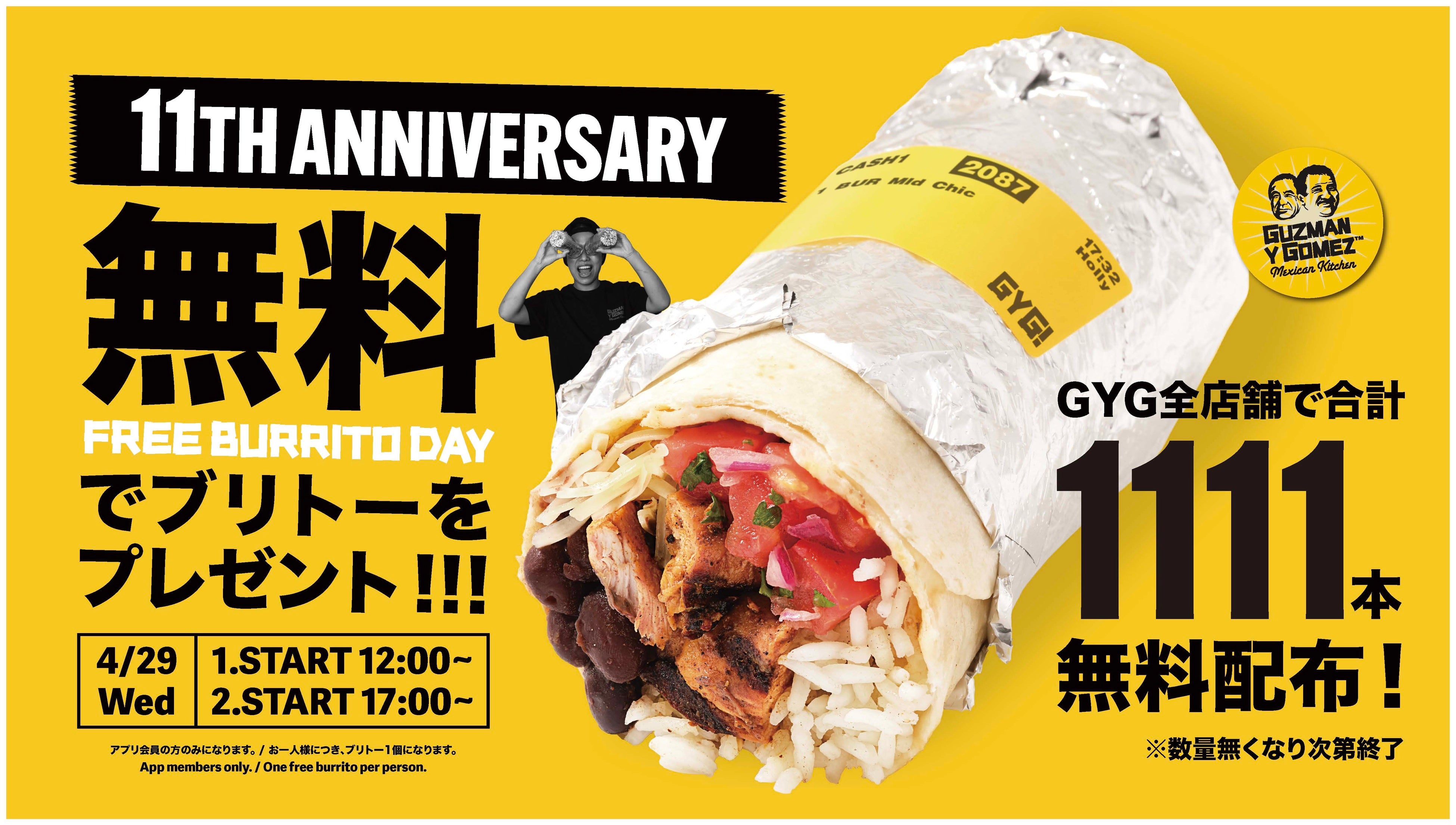 【0円ブリトー】日本上陸11周年のGuzman y Gomez、4月29日に都内5店舗で合計1,111本の無料配布イベントを開催