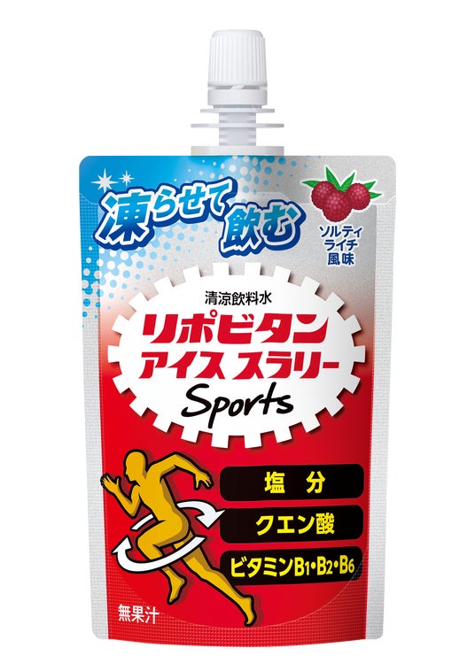 リポビタンアイススラリーSportsは、凍らせて水分中に分散した微細な氷をそのまま飲むことができる清涼飲料水です。エネルギーの源であるクエン酸とビタミンB₁・B2・B₆に加え、汗をかくと失われやすい塩分を摂取することができ、熱中症対策にも適しています。