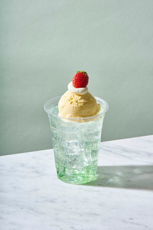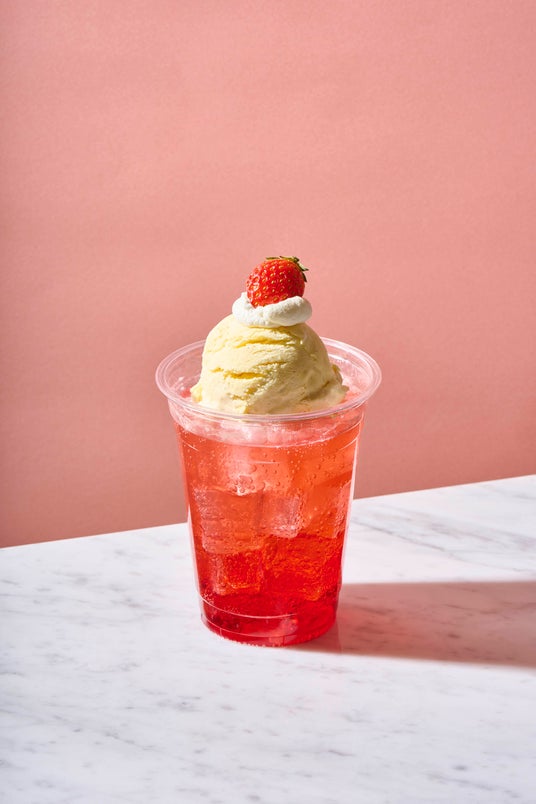 苺とバニラのシロップをブレンド。苺果汁の濃厚な味わいの中にかすかな酸味とバニラの風味を感じられるソーダに、濃厚バニラアイスをトッピングしました。