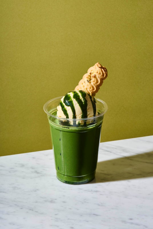 有機抹茶を使用したアイス抹茶ラテに、バニラアイス、抹茶ソース、オリジナルクッキーをトッピングしたフロートドリンク。