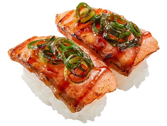 人気ネタサーモンに、青ねぎとちゃんちゃん焼きのタレをのせて炙り、北海道郷土料理のちゃんちゃん焼き風に仕立てました。