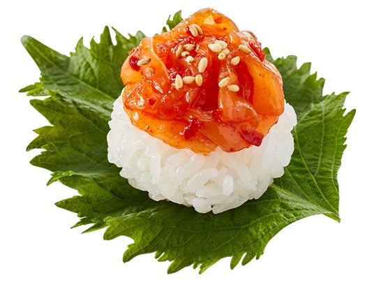 コリコリした食感のほたてひもチャンジャ風をシャリと合わせ、海苔で包んでお召し上がりいただきます。