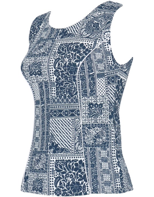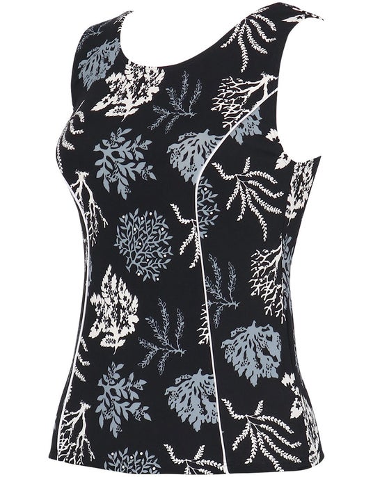 やや太めの肩ひもやストレートな袖ぐりのカッティングにより、気になるはみ肉が目立ちにくく、アウターライクに着用できるデザインに。繊細なサンゴモチーフを組み合わせた夏らしい柄を採用し、機能性と華やかさを兼ね備えた一枚です。