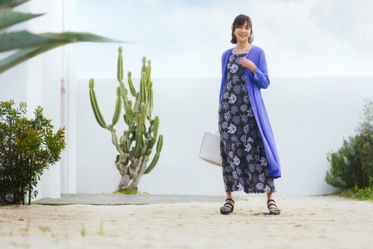 三浦りさ子さんとは、旅をイメージしたコンセプトの立案から柄の選定、細かなフィッティング確認まで協業。気になりがちな部位をさりげなくカバーするパターン設計にこだわり、アウターアイテムと組み合わせることで、体型カバーとコーディネイトのしやすさを両立しています。