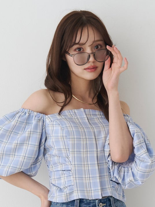 濃いめのカラーレンズで存在感はありながらも、華奢なデザインでフェミニンなスタイリングとも相性抜群。