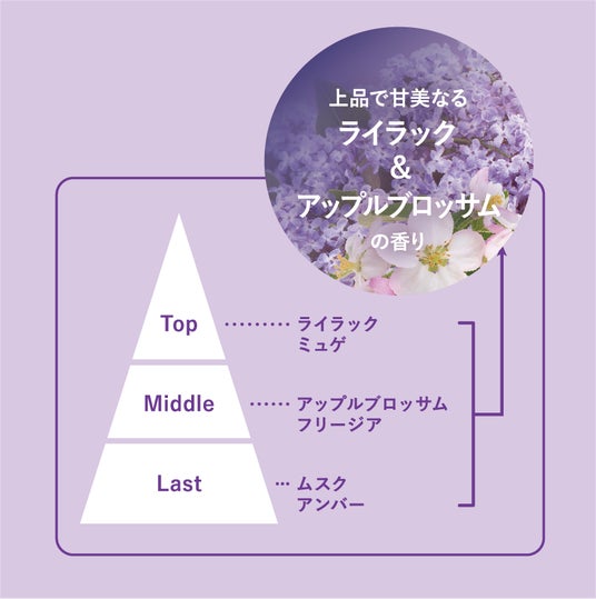【1】みずみずしく透明感のある「ライラック&アップルブロッサム」の香り軽やかに香り立つ繊細なフローラルブーケの要素にみずみずしいムスクを重ねた、透明感に満ちた柔らかな香りです。香料の一部に、開花しすぎたために切り花として販売できなくなった花をアップサイクル原料*1として使用しています。