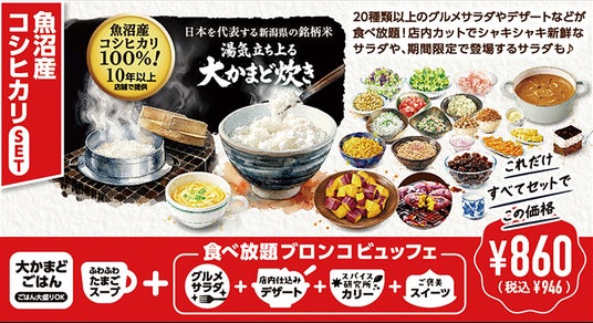 単品のメインメニューに、お好きなセットを付けて食べ放題の「ブロンコビュッフェ」をお楽しみいただけます。「魚沼産コシヒカリセット」は、当社が10年以上にわたり店舗で提供し続けている魚沼産のコシヒカリを100%使用した大かまど炊きのごはんに、食べ放題の「ブロンコビュッフェ」が付いたセットメニューです。