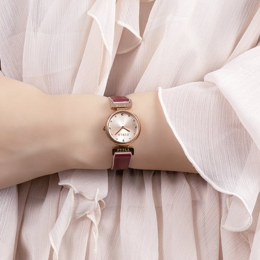 上品さを引き立てるディテール25mmの小ぶりなケースに、繊細な放射線状のギヨシェ模様をあしらった文字盤を組み合わせ、光を受けるたびにやわらかく上品にきらめきます。