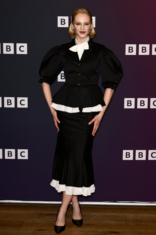 エマ・レアードは、ブラックとホワイトのコーディネートにブラックのサテンパンプスを合わせました。