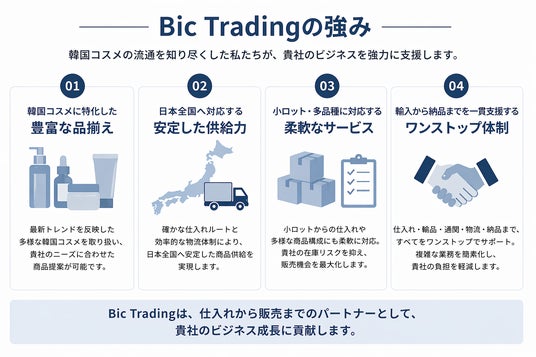 韓国化粧品の輸入・卸売事業を展開する株式会社Bic Trading(本社:大阪府大阪市)は、日本市場における韓国化粧品(K-Beauty)の需要拡大を背景に、日本企業向けの導入・流通支援サービスを強化した。