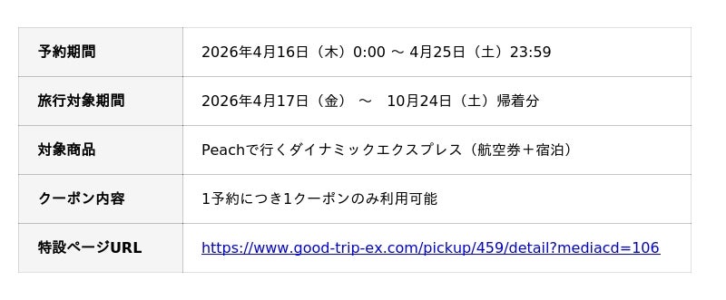 日本空輸株式会社(本社:東京都港区、代表取締役:岡下 敏也)が運営する旅行予約サイト『グッドトリップエクスプレス(グットリ)』は、 会員様限定で、航空券と宿泊を自由に組み合わせられるダイナミックパッケージが最大35,000円OFFとなる「Peachで行く春旅セール」を、2026年4月16日(木)から4月25日(土)までの10日間限定で実施します。本セールでは、ご旅行代金の合計金額に応じて利用できる、6種類の特別クーポンを配布します。今すぐ行きたい直近の旅行からGWや夏休み・秋の連休など、10月24日帰着分までが対象の短期間特別セールです。高額なご旅行ほど割引額が大きくなるため、ご家族やグループでの少し贅沢な旅をするなら、今が見逃せないチャンス!