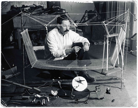 1930年10月、カルダーはパリでピエト・モンドリアンのアトリエを訪ねた際に、その簡潔さと厳密さに強い衝撃を受けた。この経験を契機に、彼は具象的参照を完全に退けた絵画を制作し、まもなく探究の場を再び彫刻へと移す。1931年のギャルリー・ペルシエでの展示では、もはや人物像の痕跡は消え去り、針金という空間の線だけが過去の仕事との連続を示していた。フェルナン・レジェのいう「純粋造形」としての彫刻であり、さらに翌年には、デュシャンが「モビール」と名づけた運動する抽象彫刻のはじまりである。