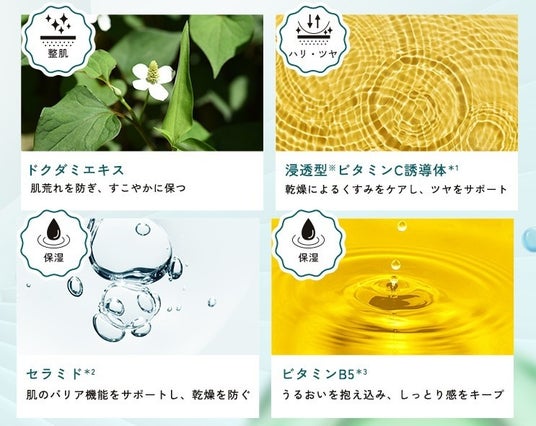 ※ 肌をすこやかに保つ *1 整肌成分 ツボクサ葉エキス *2 整肌成分 ツボクサエキス、マデカッソシド、アシアチコシド *3 ハリ・ツヤ成分 ジペプチド-15