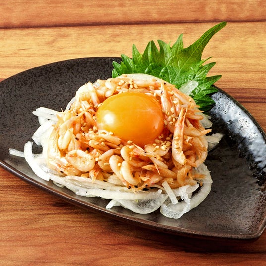■ 桜えびのユッケ 599 円(税込 658 円)香ばしい桜えびの風味と、濃厚な卵黄が絡み合い、クセになる味わいです。