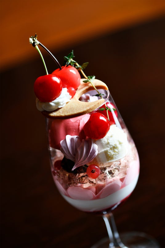 トップには甘酸っぱさが魅力のさくらんぼと、本物そっくりに作ったさくらんぼのムースを飾りました。グラスの中にはさくらんぼシャーベット、ミルク感たっぷりのジャージー牛乳アイス、ライチゼリー、ダークチェリーのコンポート、チョコレートのスポンジなどを重ねることで、爽やかな味わいから深みのある味わいへと、食べ進めるごとに変化をお楽しみいただけます。少しずつ暑くなるこれからの季節のティータイムに、さくらんぼの可愛らしさは残しながらも、シックにまとめたパフェをぜひお召し上がりください。