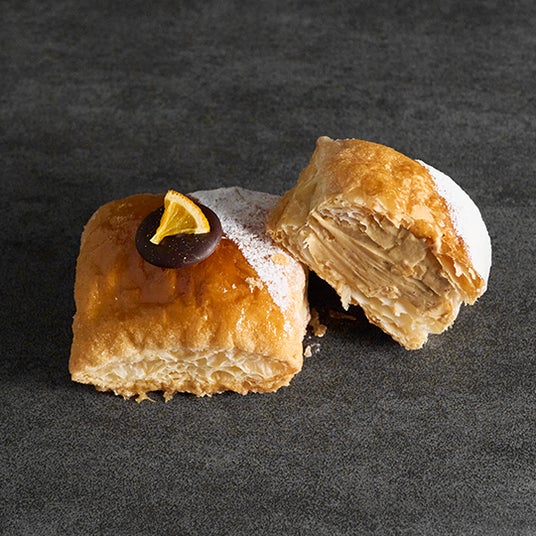 何層にも丁寧にバターを練りこんだパイ生地を、オーブンの中でふっくらと膨らませ、表面はキャラメリゼして香ばしく焼き上げました。