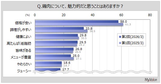 マイボイスコム株式会社(東京都千代田区、代表取締役社長:清水慎太郎)は、2回目となる『鶏肉』に関するインターネット調査を2026年3月1日~7日に実施しました。