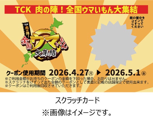 第2回開催期間中(4/27~5/1)は、大井競馬場の各入場門において、イベントの店舗マップ・メニュー表入りの「チラシ」と、「スクラッチカード」が入ったオリジナルデザインの「ミニクリアファイル」を数量限定で配布します。クリアファイルは、馬券やマークシートを収納するのに最適なA5サイズです。さらに、「アタリ」が出たスクラッチカードは、「TCK 肉の陣!全国ウマいもん大集結」の出店店舗で500円分の割引クーポンとしてご利用いただけます。