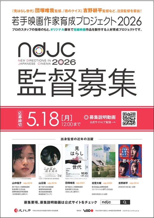 特定非営利活動法人映像産業振興機構(略称:VIPO[ヴィーポ]、理事長:松谷孝征、所在地:東京都中央区)では、文化庁委託事業「ndjc:若手映画作家育成プロジェクト2026」(正式名称:令和8年度 若手映画作家等の育成事業)において、2026年度の参加監督を募集します。
