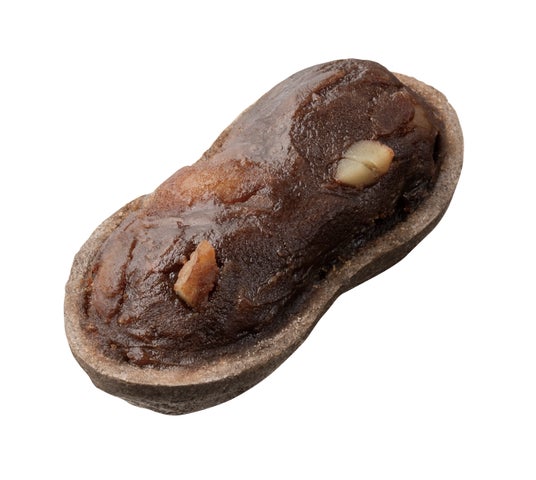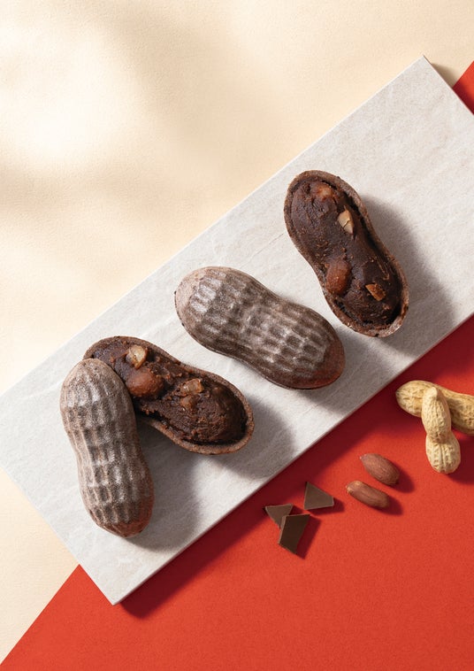 落花生の甘煮とチョコレートを合わせた餡を、ココアパウダーを練り込んだ最中種で挟みました。餡は、なめらかでコクのある味わいです。チョコレートの存在感をしっかり楽しみながら、後からぴーなっつのやさしい風味が重なります。最中種にはココアパウダーを練り込み、香ばしい風味に仕上げました。