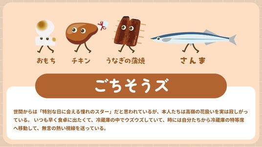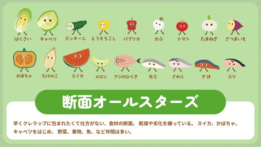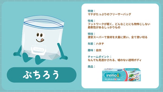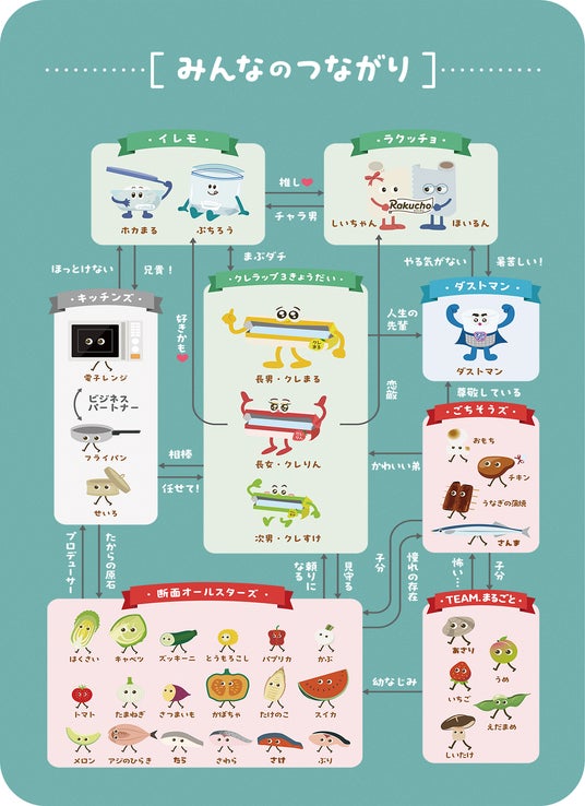 「クレハフレンズ」はなんと“総勢35人”。「NEWクレラップ」「Rakucho(ラクッチョ)」「iremo(イレモ)」「ダストマン」の各ブランドキャラクターの他に、クレラップで包まれることを望んでいる食材の断面たち「断面オールスターズ」など、個性あふれるキャラクターたちが勢ぞろいしています。今回公開したクレハフレンズ特設WEBページでは、各ブランドのメインキャラクターと、その「なかまたち」の性格や特徴、相関図を紹介していますので、是非ご覧ください!