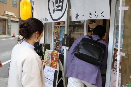心を満たした2人が続いて向かったのは、去年12月にオープンした立ち呑み店【銘酒と地酒 肴・きらく】。こじんまりとした店内ながら、日本酒は40種類以上の品揃えです!