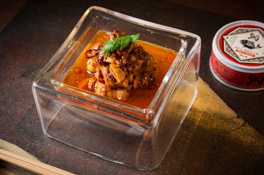 愛媛県産真鯛を塩締め・アライで仕立て、沖縄石垣島産の唐辛子ソースで仕上げた一缶。鯛の上品な甘みと火鍋の旨辛が絶妙に絡み、日本酒との相性は抜群です。