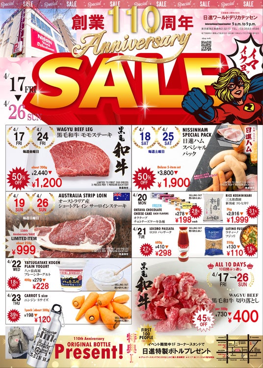 創業大正五年(1916年)日進畜産工業株式会社は、110周年の節目を記念して、直営スーパー「日進ワールドデリカテッセン」(東京都港区麻布)で大型セールの開催やオリジナル記念グッズの販売を展開します!