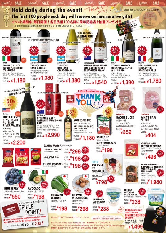 目玉商品として、お店の特色である「黒毛和牛」「通常販売していない周年セール限定のオーストラリア産サーロイン」「日進ハムスペシャルパック」「各国人気のワイン」などを特別価格で提供いたします。また、さまざまな食品メーカーによる試食会も店内で開催されます。