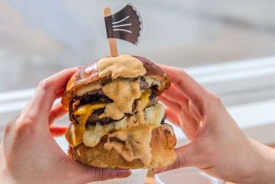 ルデラの5年間を象徴するのは、5段のパティと5種のチーズを重ねた、総重量500gの特製バーガー。
