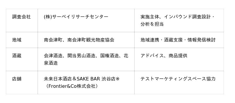 実施にあたり、南会津町、南会津町観光物産協会、南会津町の酒蔵(会津酒造、開当男山酒造、国権酒造、花泉酒造)、渋谷の日本酒バー(未来日本酒店&SAKE BAR 渋谷店)と連携します。