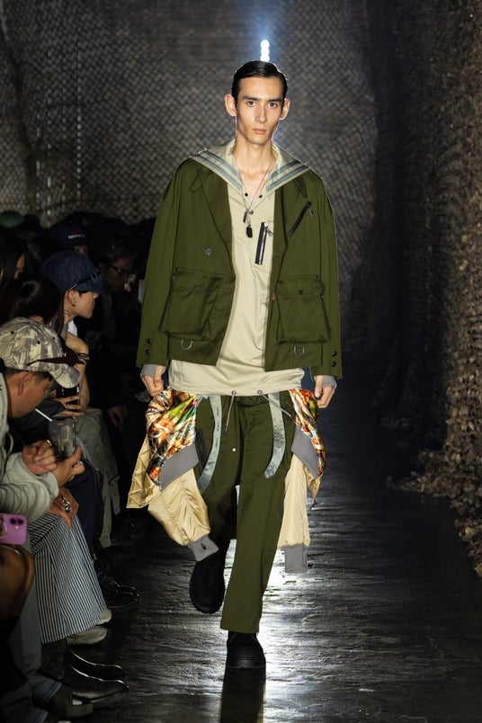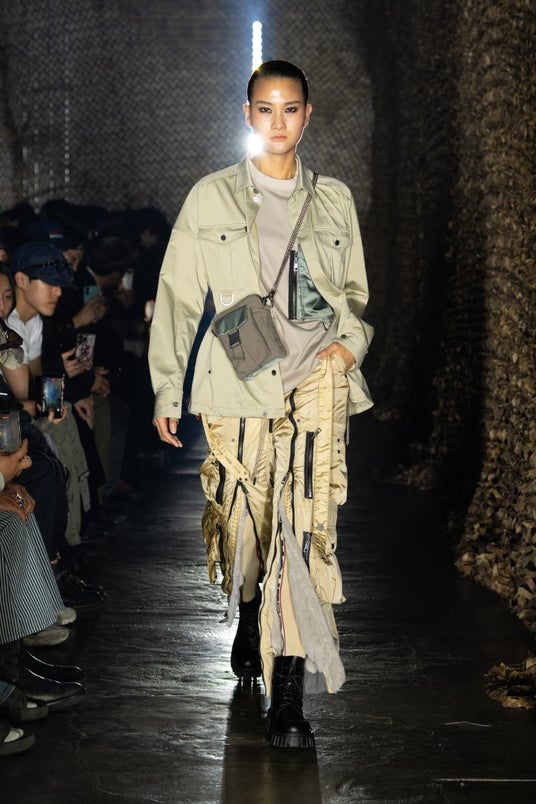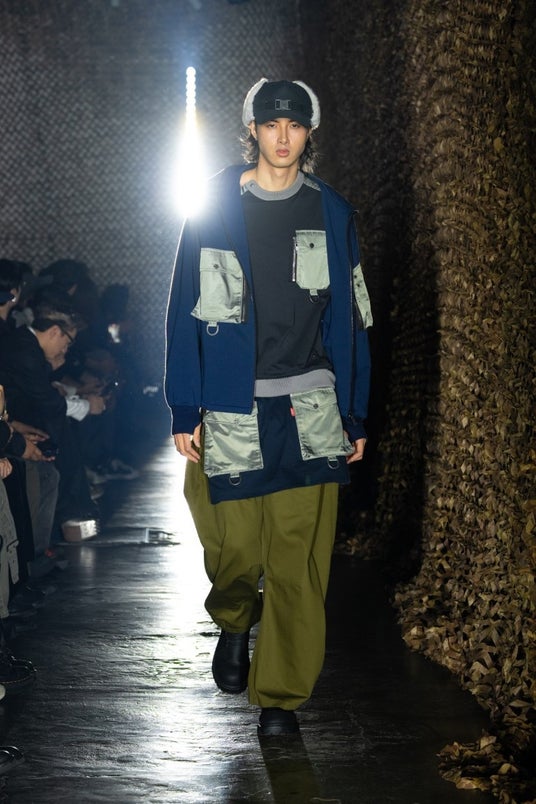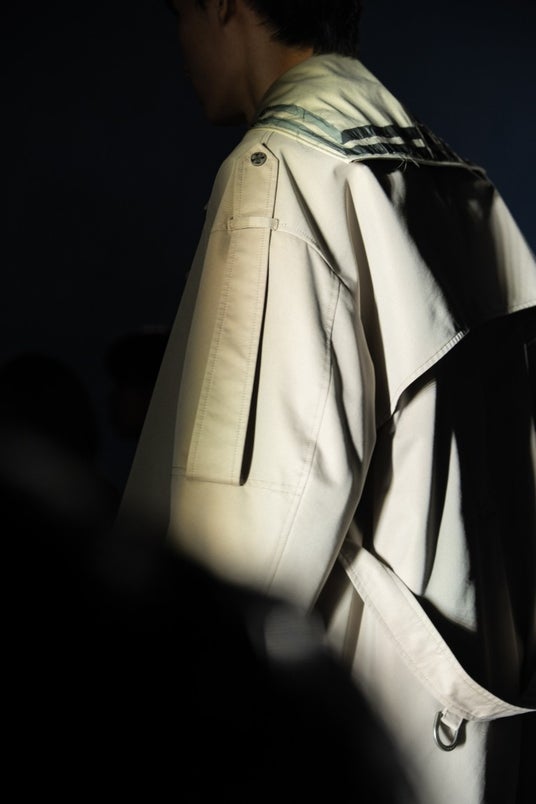 展開されるアウターには、ミリタリー由来のパラシュートベルトを搭載。着用時だけでなく、背負う動作によって裏地に施されたグラフィックが現れる仕様とするなど、機能性と視覚的表現を両立しています。